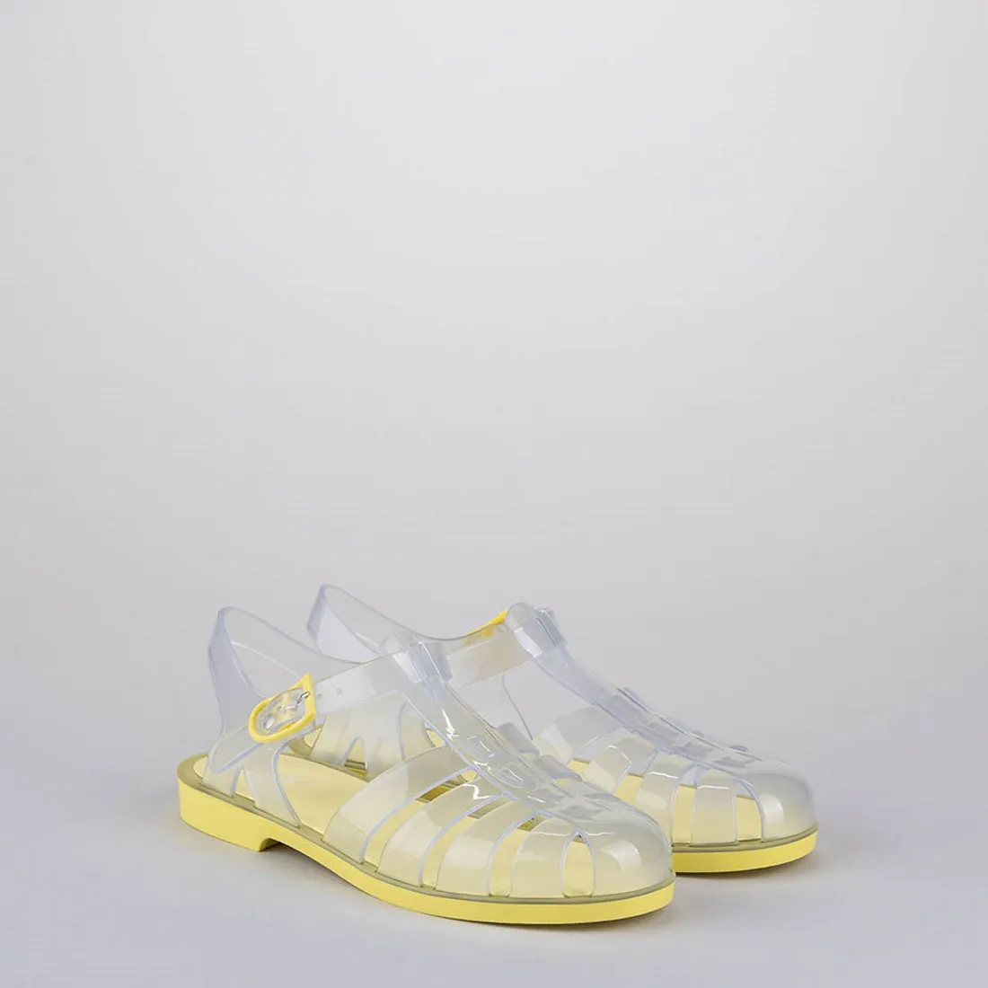Cangrejera translucida con acabado en brillo y bicolor, estilo retro. Lleva la plantilla en amarillo y cierre con hebilla. La altura del tacón es de unos dos centímetros aproximadamente.