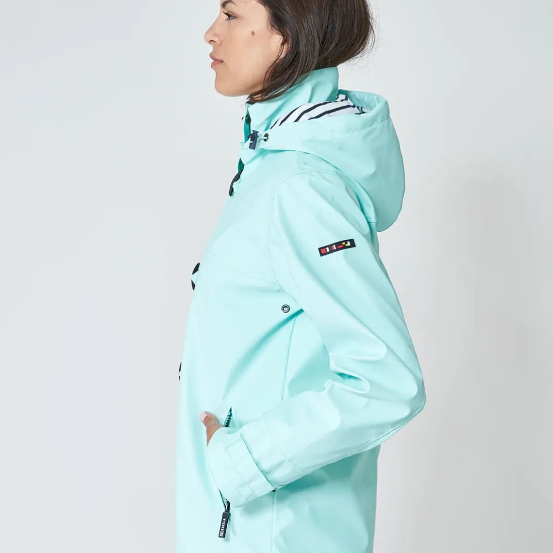 Chubasquero marinero de BATELA, impermeable de poliester 100% con revestimiento de poliuretano en color rosa, combinando la deportividad con un estilo urbano. Cierre frontal con cremallera cubierta por una solapa. Tiene capucha desmontable mediante cremallera y cordones para poder ajustar. Bolsillos laterales ribeteados con cierre de cremallera. Los puños son ajustables. El forro de la capucha, del interior y de las mangas es de un rayadito clasico marinero azul y blanco, de algodón cien por cien. Prenda adecuada para días de verano y primavera, aportando una apariencia navy al look.