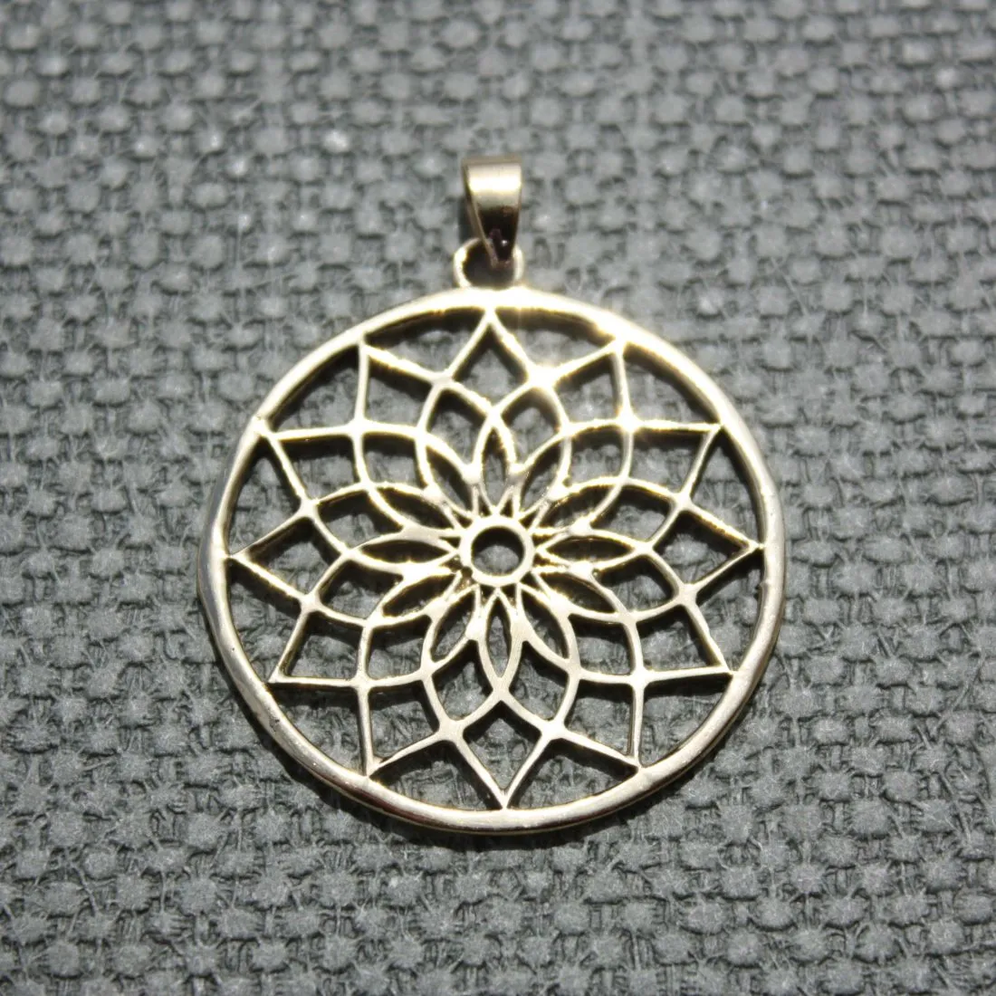 Colgante en latón dorado en forma de mandala y dibujo de Flor de Loto. Su tamaño es de 3,5cm de diámetro y de 4cm con el eslabón. No se envía con cadena.
