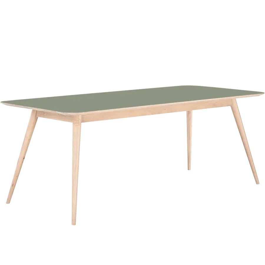 The table plate is constructed either from solid oak or from desktop linoleum—a natural, warm, smooth, and antibacterial material—affixed to a beech plywood base. For the solid oak variation, steel stiffeners are incorporated at the plate’s bottom side, mitigating minor dimensional changes in the wood due to hygroscopy.