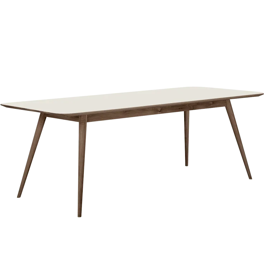 The table plate is constructed either from solid oak or from desktop linoleum—a natural, warm, smooth, and antibacterial material—affixed to a beech plywood base. For the solid oak variation, steel stiffeners are incorporated at the plate’s bottom side, mitigating minor dimensional changes in the wood due to hygroscopy.