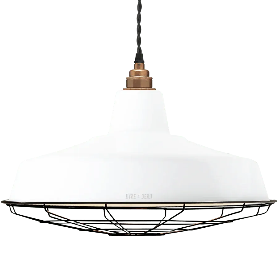 Pantalla grande de esmalte blanco con reflector interior blanco brillante. Estas cortinas están equipadas con una jaula extraíble con recubrimiento de polvo negro satinado. Las lámparas iluminarán áreas grandes cuando estén elevadas o pueden proporcionar una luz más íntima de menor intensidad cuando se combinen con una bombilla más pequeña y de menor potencia. Las pantallas de las lámparas se suministran desnudas; los accesorios, el cable y la bombilla se muestran solo a modo de ilustración. Pantalla recomendada con bombillas LED.