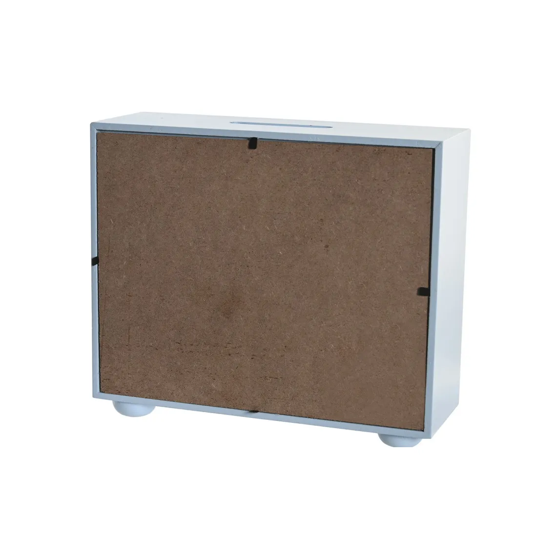 Esta hucha tan especial está fabricada en madera natural. Su forma es cuadrada con ranura en la parte superior para introducir el dinero. Ayuda a los niños a ahorrar sus primeras monedas a la vez que añade un toque a la decoración de su habitación.