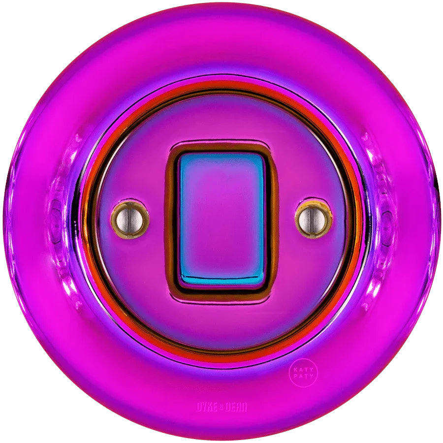 Interruptores retro rediseñados fabricados en Europa por Katy Paty. Este con diseño morado viene con el interruptor de botón más grande. Hecho de porcelana tradicional que es grabado y resistente a la abrasión. Los colores son constantes y, a diferencia de los colores de los plásticos, son UV y Resistente al polvo. Color constante y superficie altamente resistente a la abrasión. Esmaltado y hecho a mano con un brillo superior. CE Certificado de conformidad disponible bajo petición. Cubierta decorativa. Garantía 50 años.