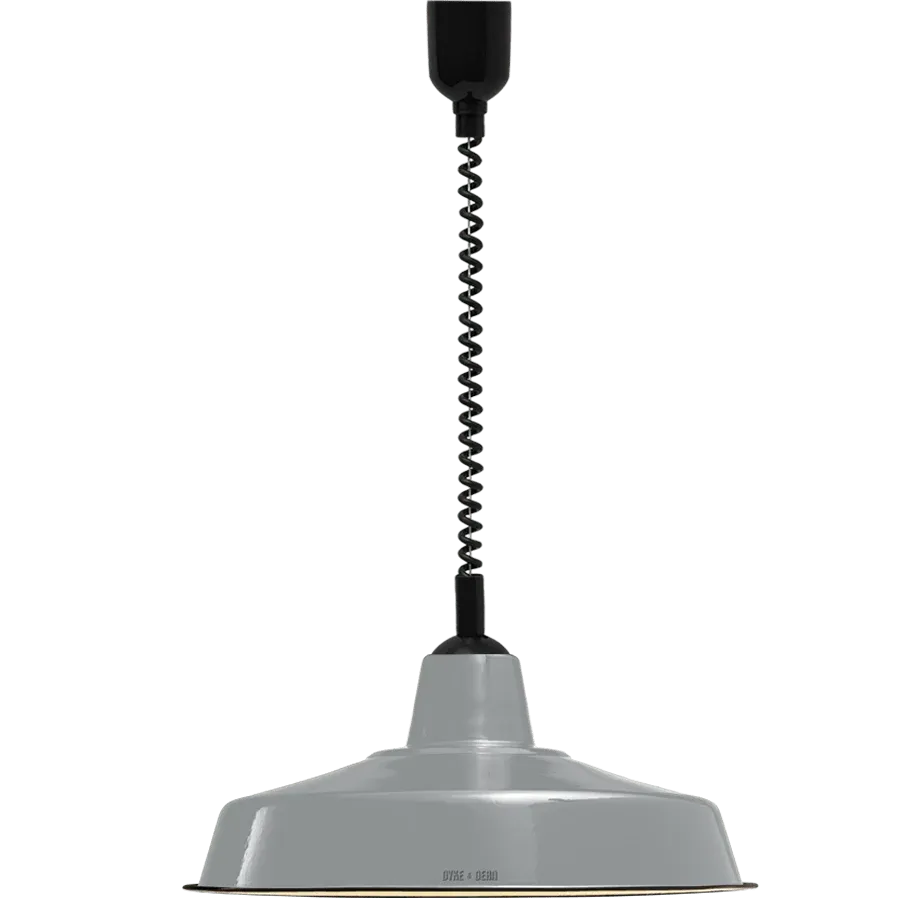 Dyke & Dean tiene un gran acabado de esmalte gris en la superficie superior con un reflector interior blanco brillante con borde negro. Estas cortinas iluminarán áreas grandes cuando estén elevadas o pueden proporcionar una luz más íntima de menor intensidad cuando se combinen con una bombilla más pequeña y de menor potencia.