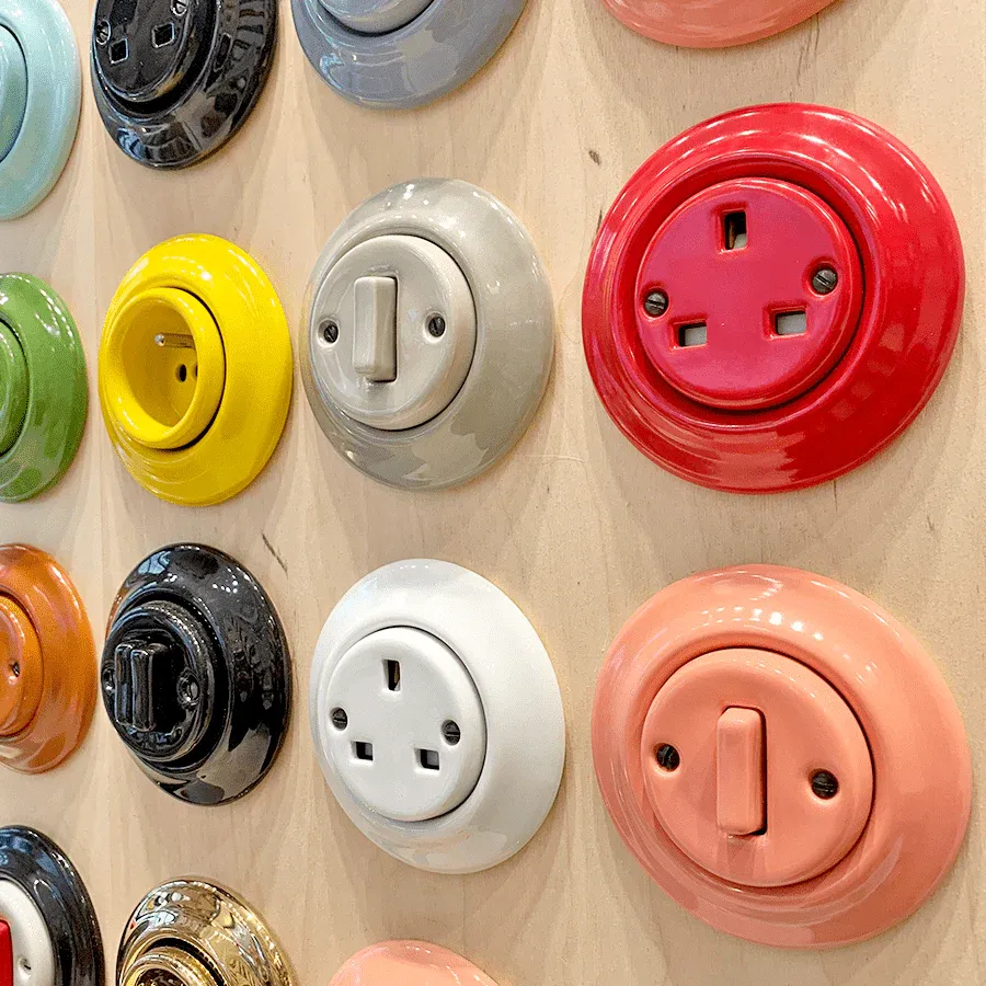Re-designed retro switches manufactured in Europe by Katy Paty. This design comes with a larger button switch. Made of traditional porcelain which is engrained and abrasion resistant. The colours are constant and, unlike colours of plastics they are UV and Dust resistant. Constant colour and highly abrasion-resistant surface. Enamelled and handmade in a top glossy quality. CE conformity certificate available on request. Decorative cover. Guarantee 50 years.