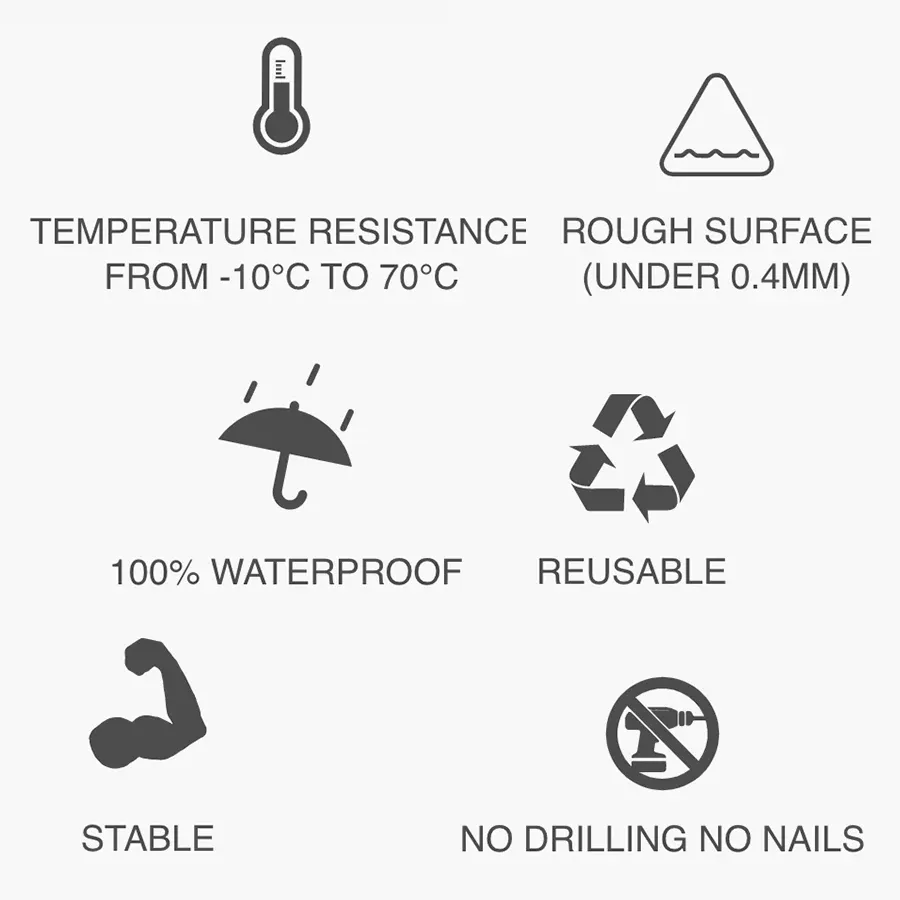No drilling or nails, waterproof, heat resistant to 70 degrees & cold resistant to -10 degrees, stable & reusable.