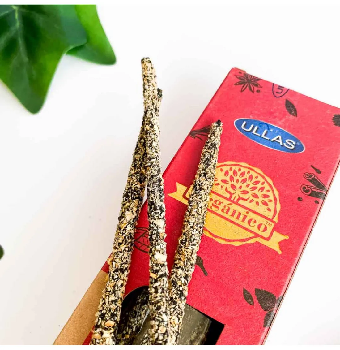 Este incienso se presenta en una caja con forma rectangular. Cada una contiene 25 gramos de incienso. El incienso de Palo Santo de ULLAS está hecho a mano con palos de Palo Santo de alta calidad. Está libre de productos químicos y aditivos, lo que lo convierte en una opción segura y saludable para su uso.
