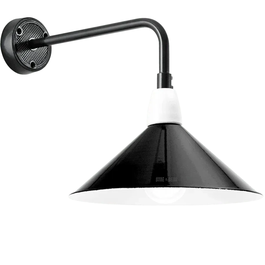 Una lámpara tradicional con un clásico reflector interior cónico blanco y brazo de pared. Fabricado con piezas prensadas de fabricación tradicional y elementos individuales de porcelánico. Gracias a la construcción del marco montado en diagonal, la luminaria difunde una luz especialmente agradable y sin deslumbrar.