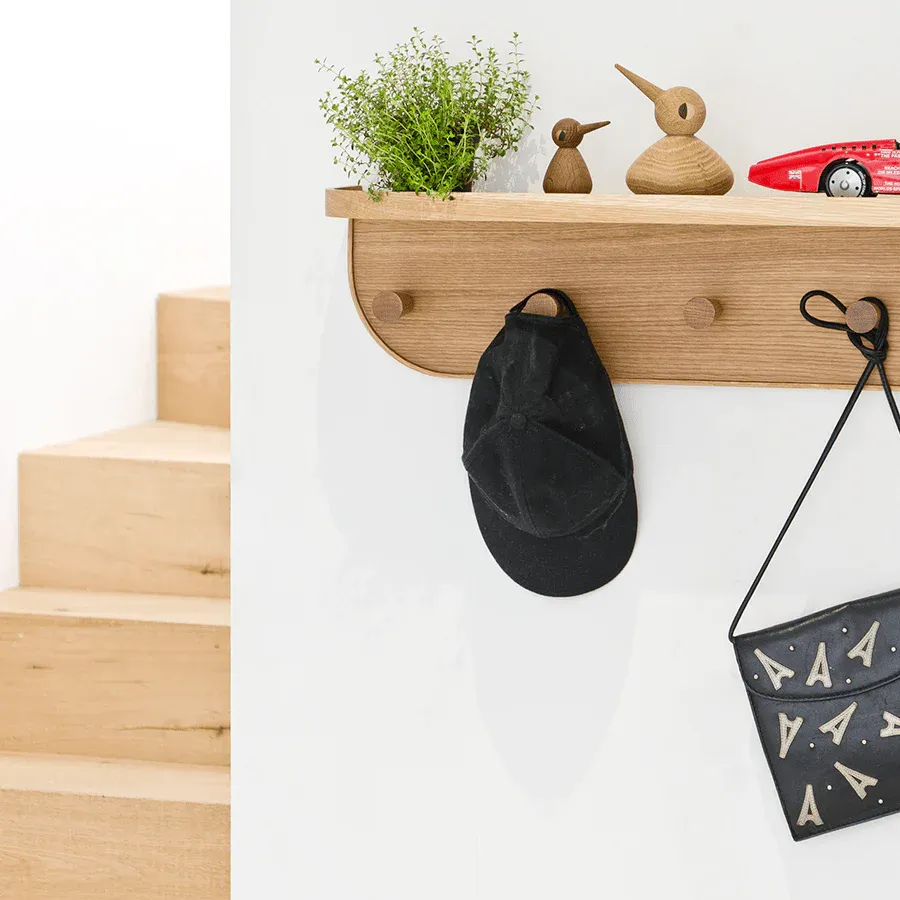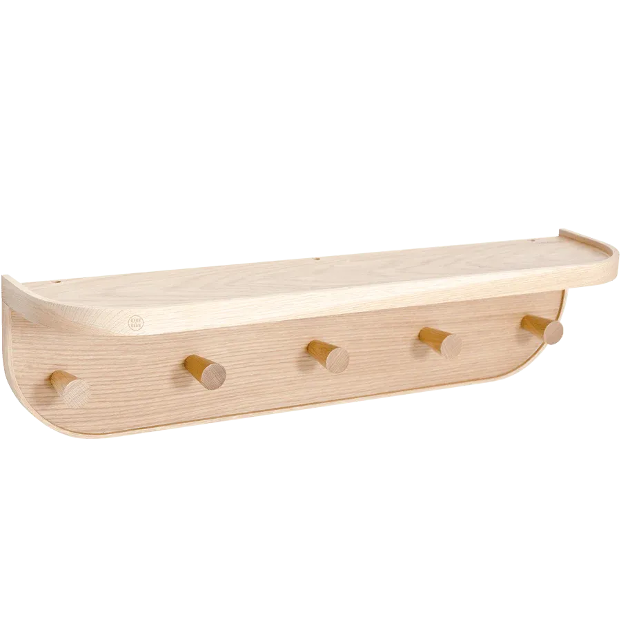 Nook, shelf and coat hook organiser conveniently goes in a hallway, cloakroom or storage cupboard. The handy shelf is the place for hats, tennis racquets and cycle helmets. Load up the five oak pegs with coats, the dog’s lead, baseball caps, umbrella and shopping bags. Nook’s elegant curved edges blend harmoniously with warm oak colours whilst at the same time keeping things off the floor and out of the way.