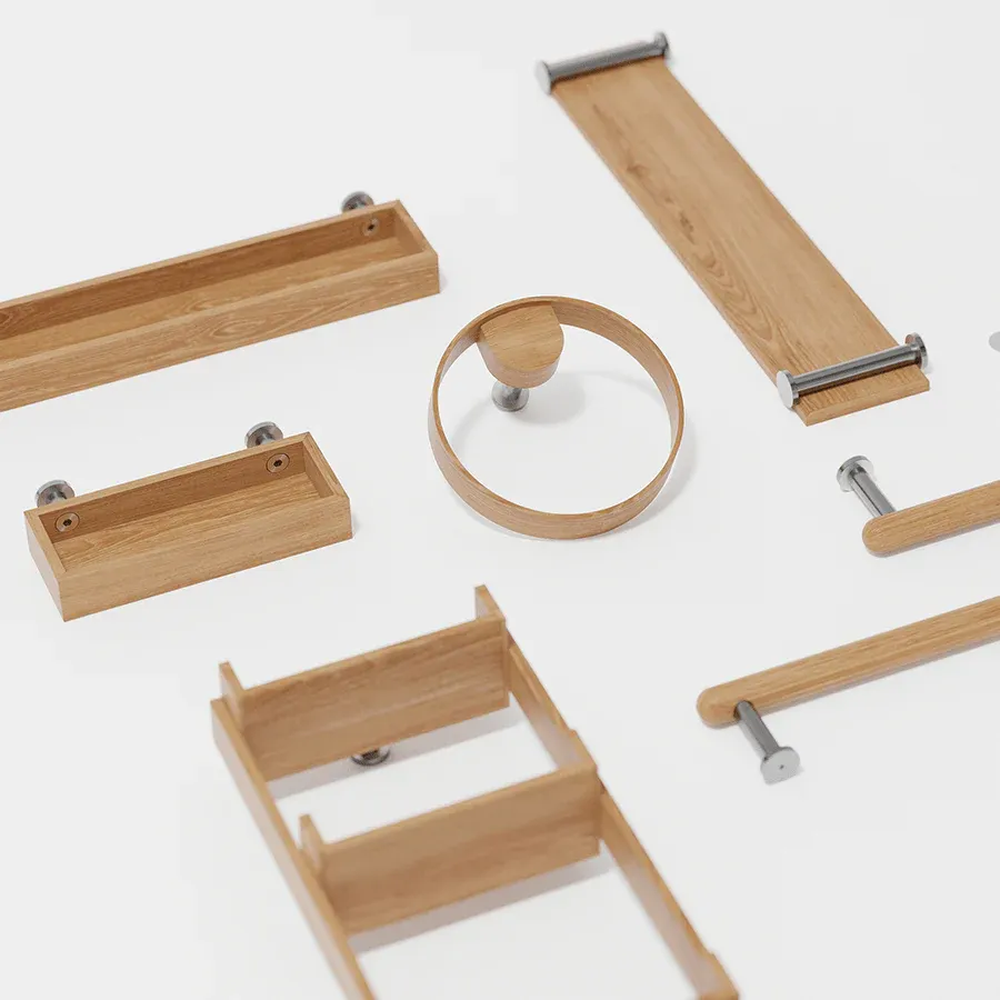 ‘Yoku’ – meaning bath in Japanese is a refined collection of bathroom furniture and wall fittings. The rounded, smooth wood parts complement perfectly the precision-engineered, matt stainless steel fixings.
